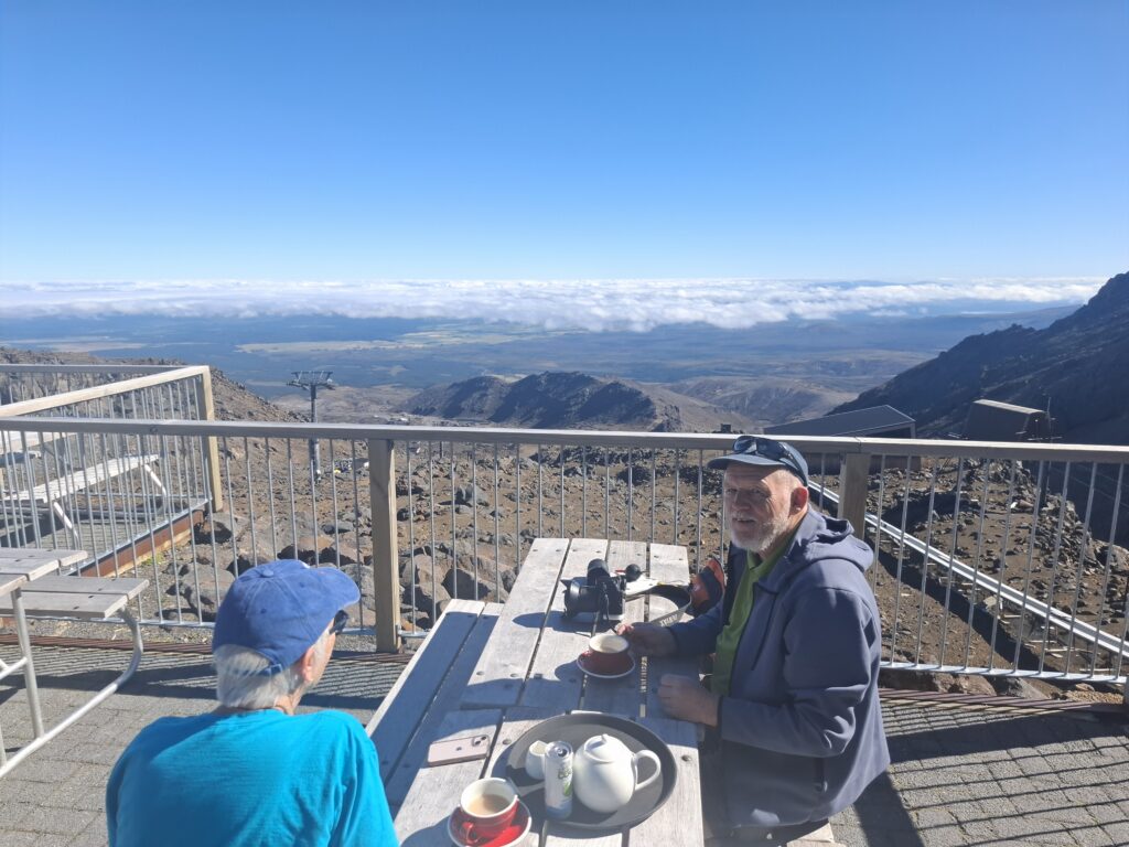 The next day brought them into Tongariro National Park. They stopped at Tawhai Falls, better known as Gollum’s Pool, before heading up the mountain to Whakapapa. The Sky Waka gondola took them up to New Zealand’s highest café, where they sat with a cuppa at 2020 metres, looking out over the volcanic landscape.