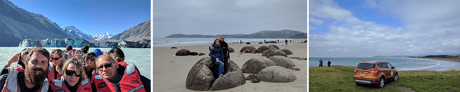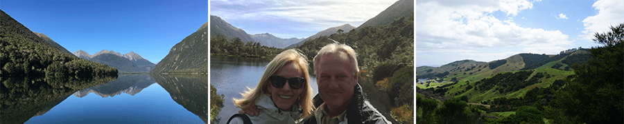 “I’m not sure where to start with highlights of the trip – there were so many. We really enjoyed our stays in Paihia, Whitianga, Rotorua, Wellington (the Bolton Hotel is beautiful), Hanmer Springs (The St James was great) Franz Josef, and Wanaka (Lakeside Appts were great and the town was a real favorite). We took lots of hikes and had many delicious meals. We had a wonderful tour and lunch at Gibbston winery. We also enjoyed the Wai O Tapu thermal wonderland, the Weta Cave tour, the Milford Sound cruise, the Auckland War Memorial Museum, the Ferry to Russell Island, Waitangi – Haruru Falls nature walk, boat tour of Whitianga bay, Hobbiton tour, Te Puia thermal village, the Wellington botanical gardens and various museums, the Rocky Mountain track in Wanaka (I think). Both cars were great and the ferry ride was beautiful. We really loved driving and taking in all of the views, and of course stopping frequently to take pictures. The people were all so nice, from the wait staff at the restaurants to the people we met on hikes, etc. Although we got off to a bit of a rocky start, the trip overall was wonderful.”